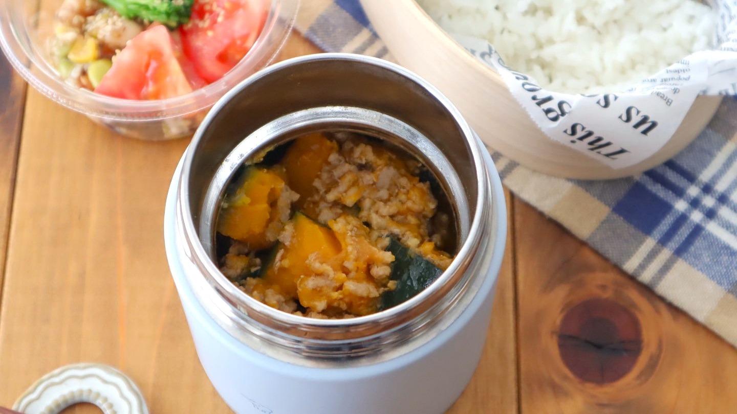 報告レンジで一発!かぼちゃのそぼろ丼でスープジャーで弁当