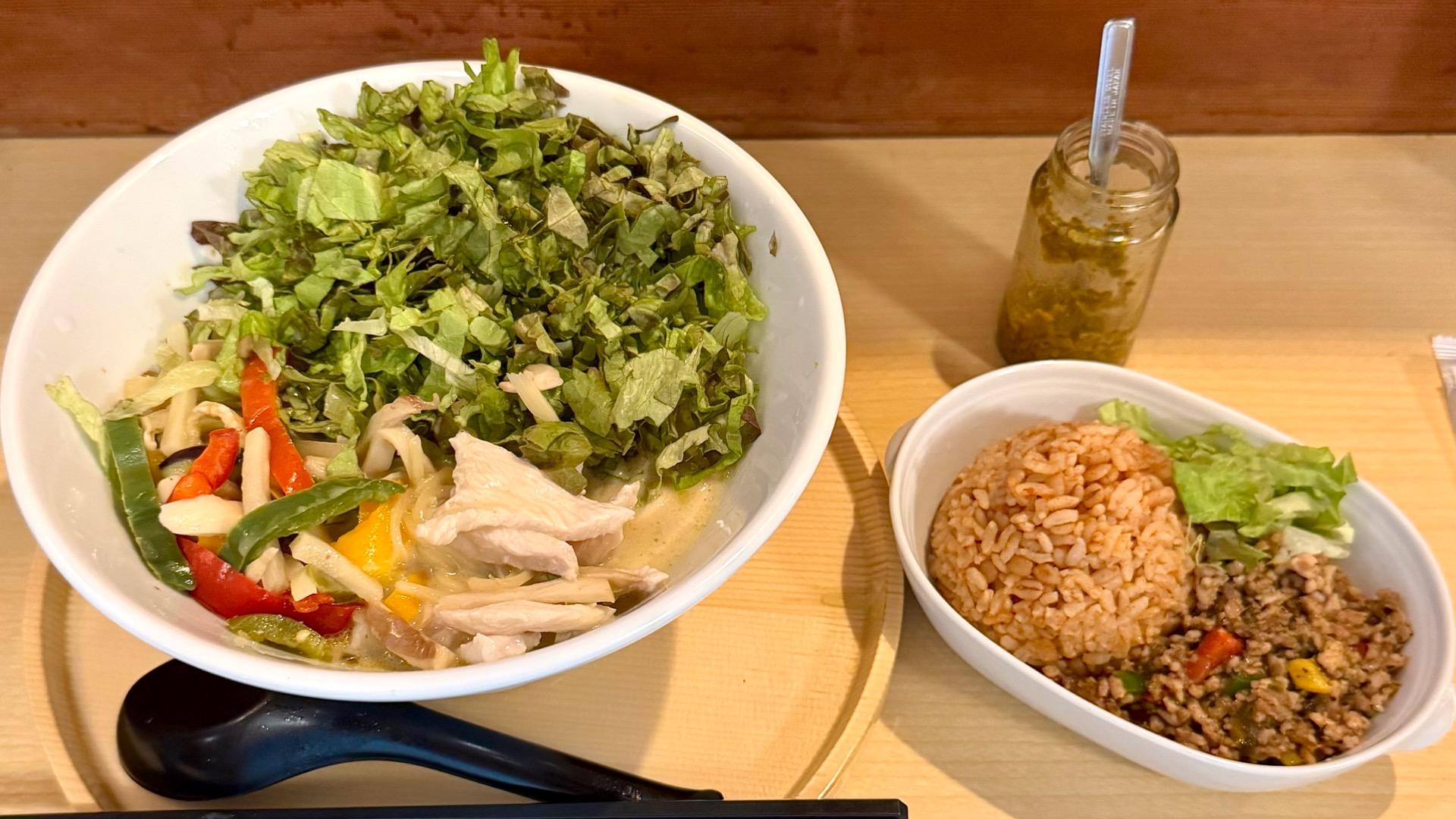報告野菜たっぷり150g!鶏ササミも入ったヘルシーなグリーンカレーラーメン!〆のチャイサービスも嬉しい!