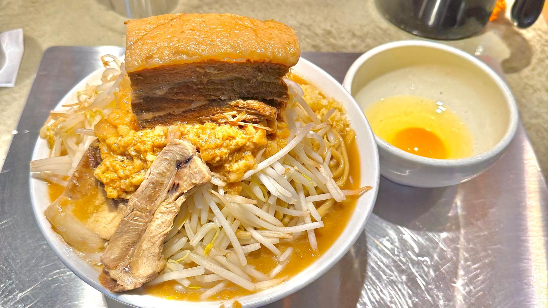 報告圧巻の肉塊!!これが食べれるのは週2回のみ!盛り盛り二郎系ラーメンにとろとろの豚チャーシューの塊が!