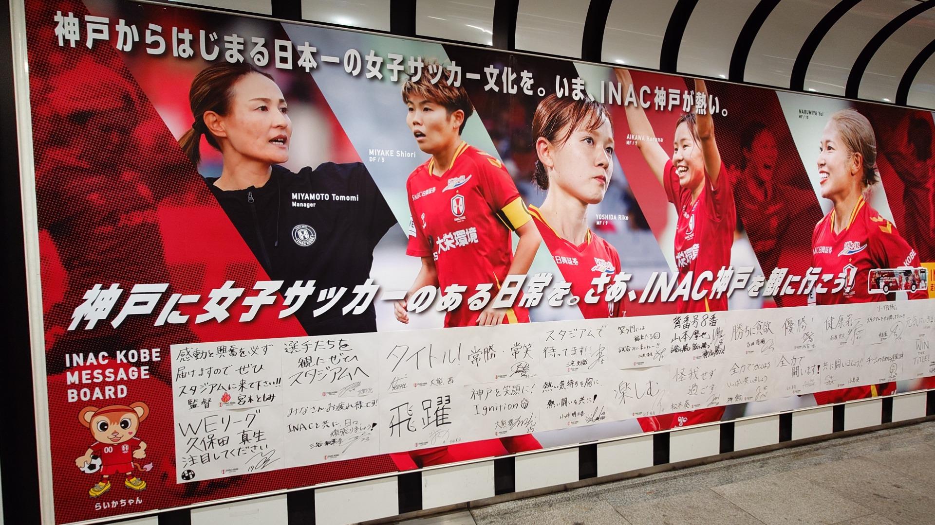 報告【神戸市中央区】INAC神戸、宮本監督・大野コーチ・選手らによる直筆メッセージが地下鉄三宮駅に!