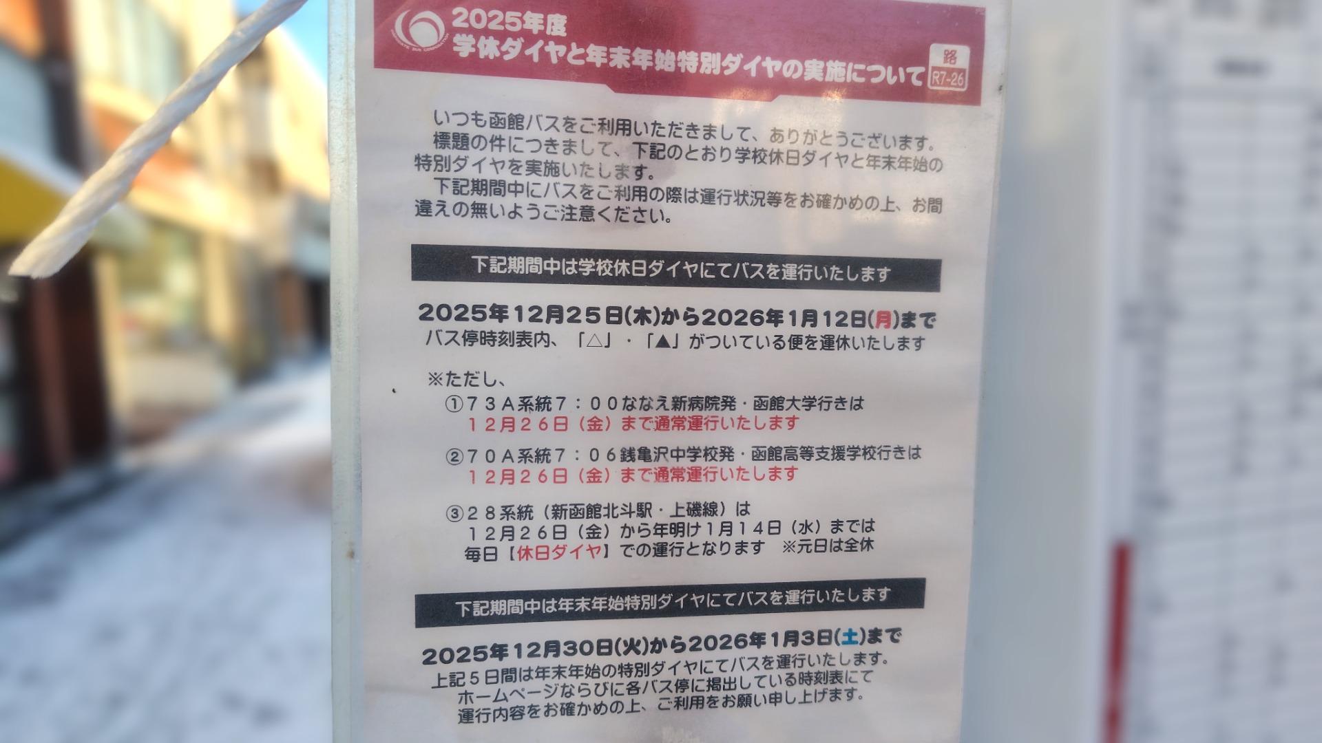 報告【函館市】運行休止の便も。時刻変更や減便など函館バスが特別ダイヤで運行『年末年始運行ダイヤ』