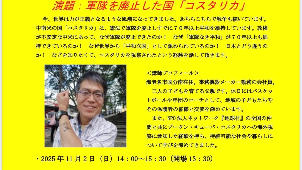 報告【海老名市】えびなえんぴつの会主催。テーマは、軍隊を廃止した国「コスタリカ」講師:吉信誠一さん