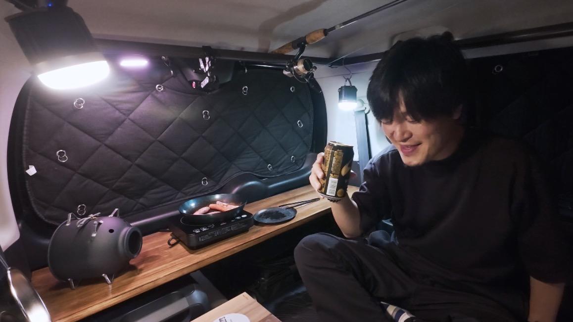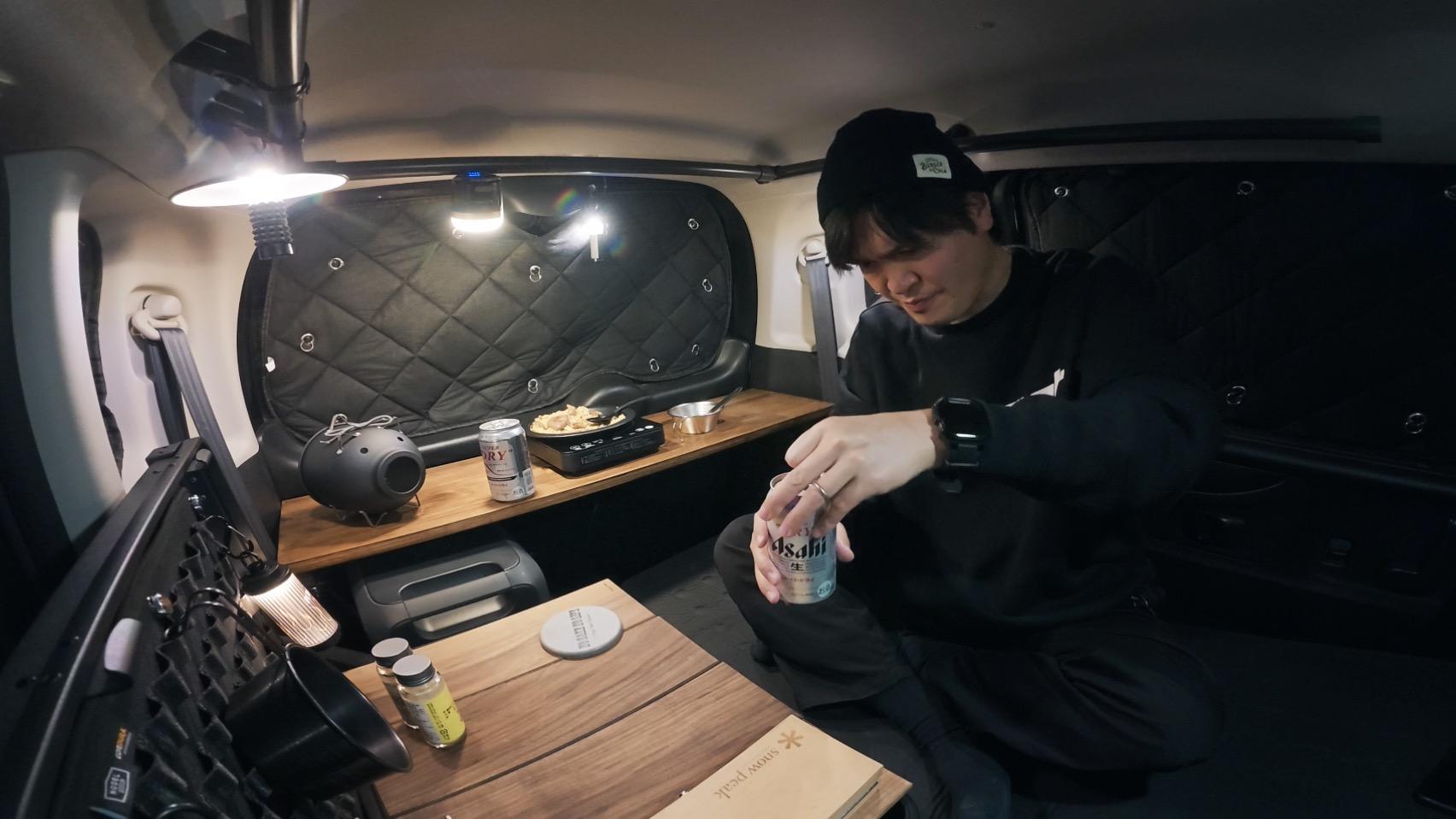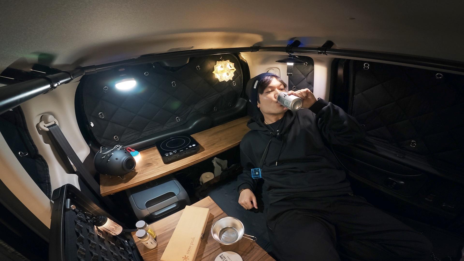 報告軽自動車=秘密基地!N-BOX車中泊で楽しむ“居酒屋ナイト”