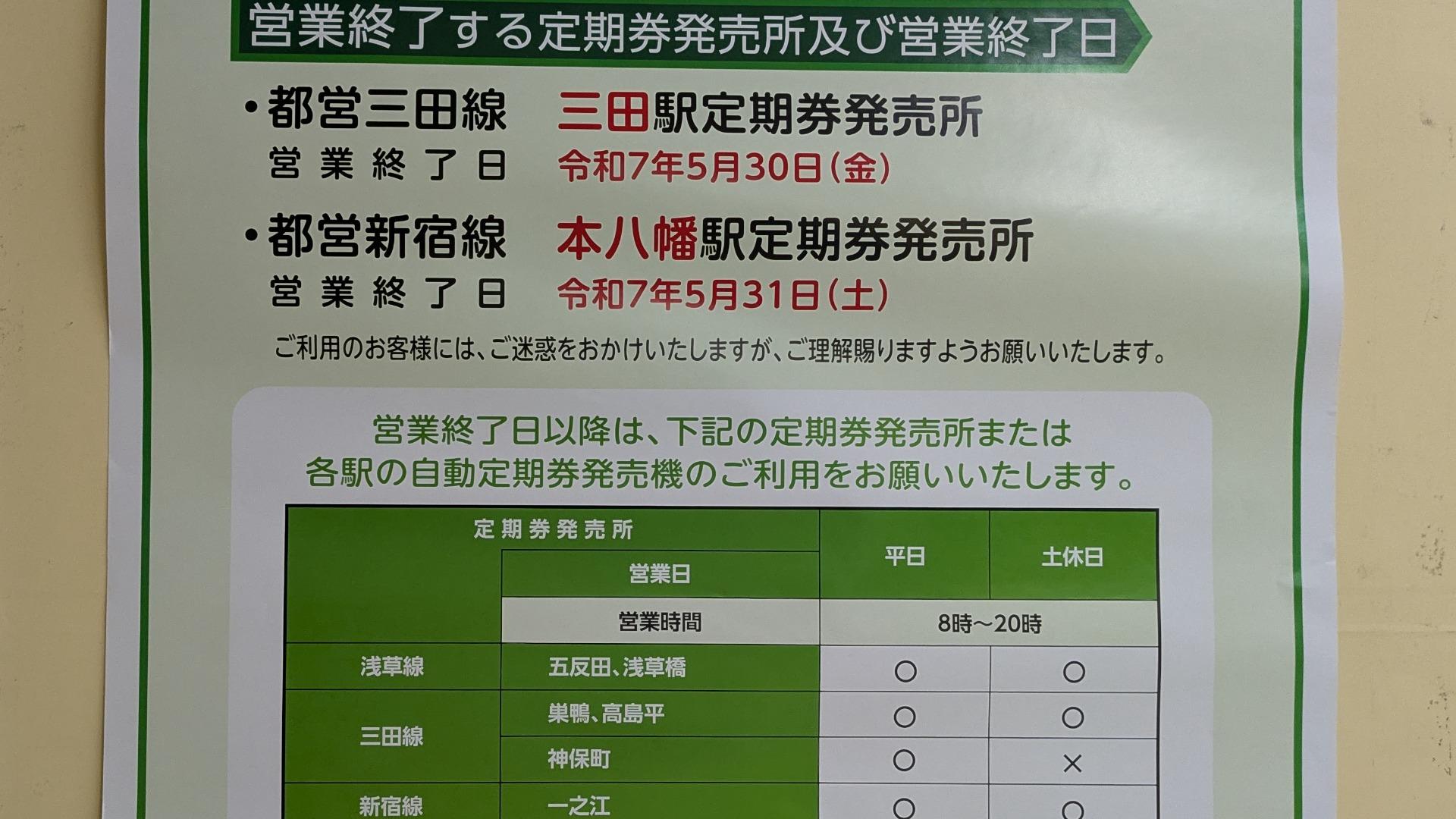 報告【市川市】「悲報」都営新宿線本八幡駅の定期券発売所が5月31日(土)で閉鎖。