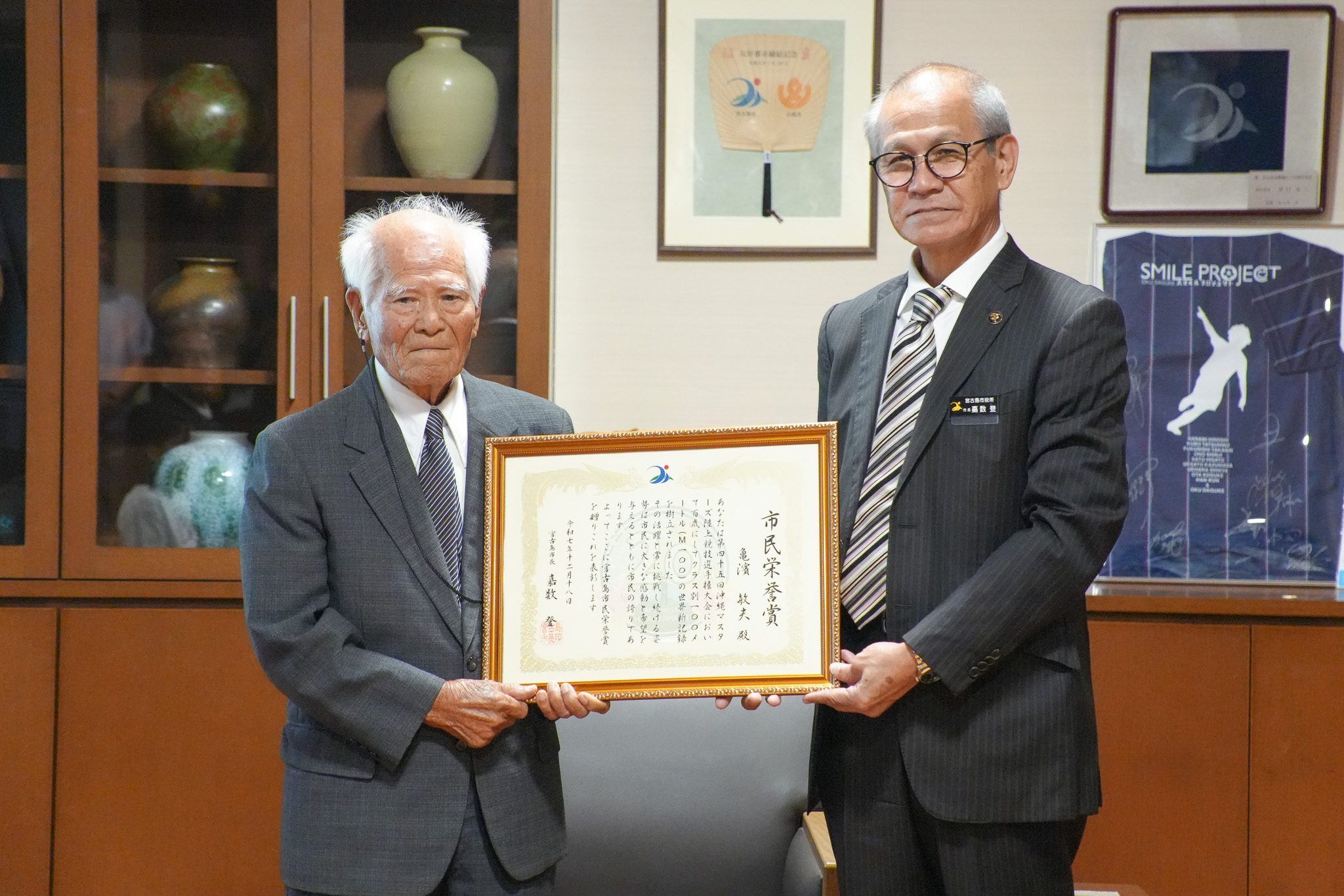 報告亀濱さんに市民栄誉賞 宮古島市第1号 100歳の世界記録は偉業