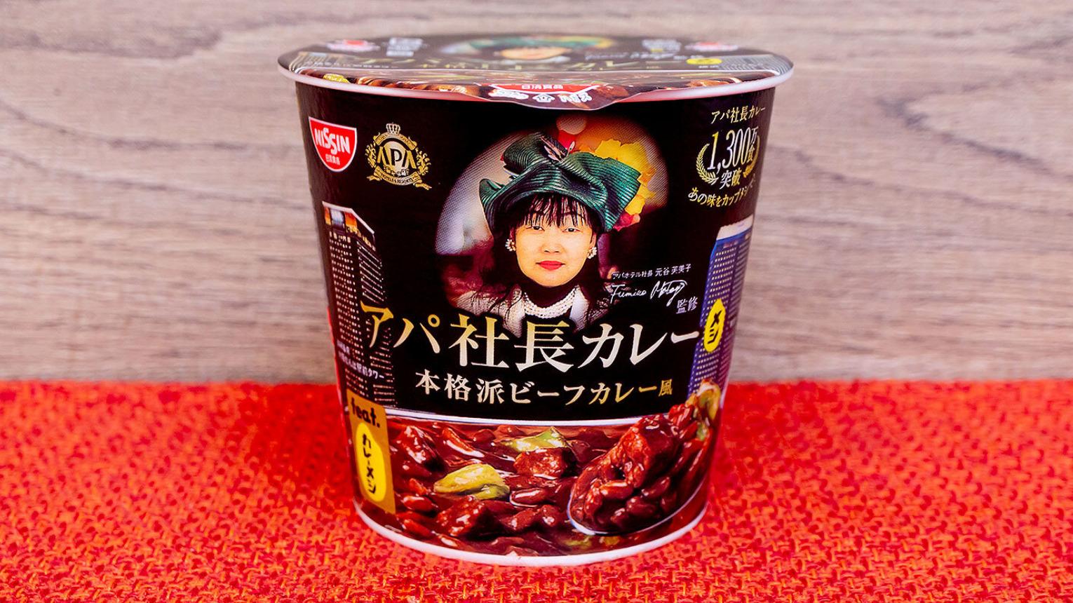 報告「アパ社長カレー」と「日清のカップメシ」コラボ パッケージに元谷芙美子氏の顔